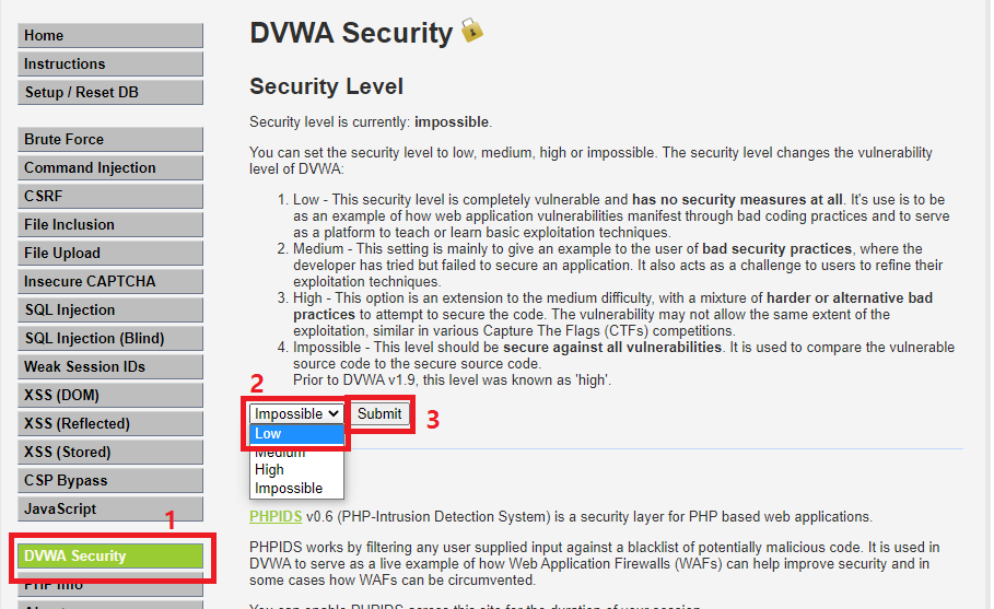 왼쪽의 메뉴들 중 DVWA Security 탭으로 이동해 Security Level을 Low로 설정한 후 Submit을 해주자