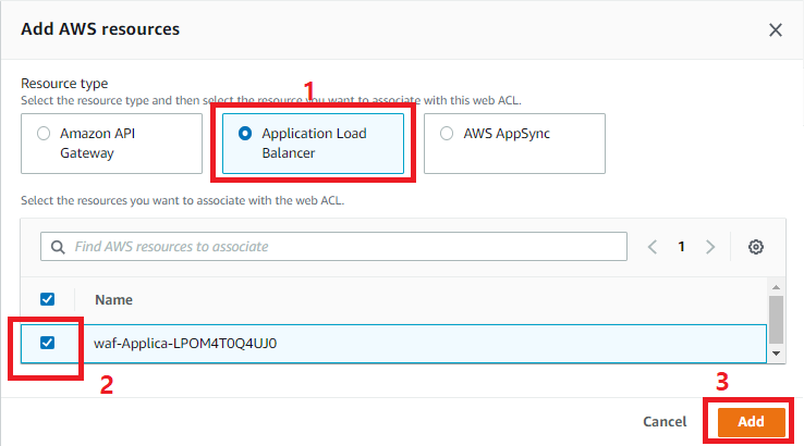 아래의 Add AWS resources를 눌러 생성되어 있는 ALB를 선택해 Add 해준다