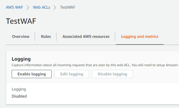 방금 만든 WAF를 눌러 Logging and metrics 탭으로 들어가보자