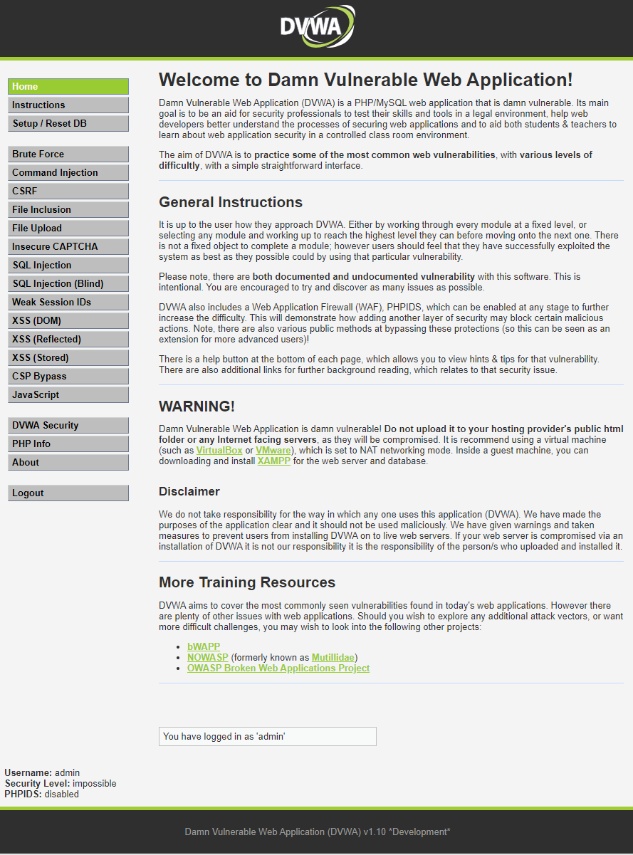 2. 만들어진 DVWA 확인