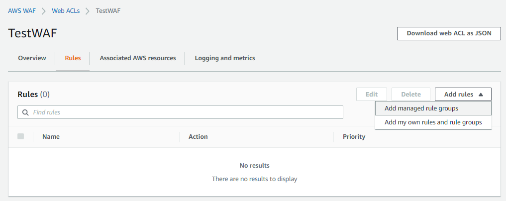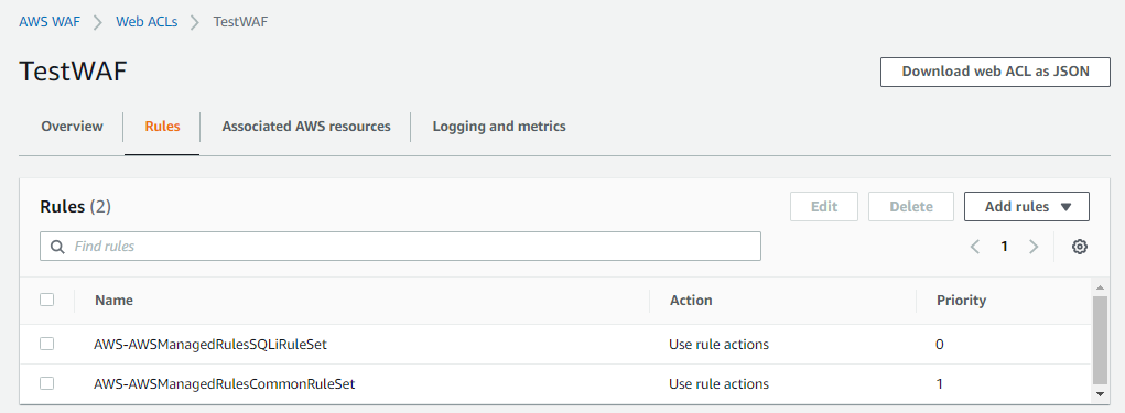 저번 글에서 생성한 WAF의 Web ACLs로 들어와 Rules 탭으로 들어가보자
