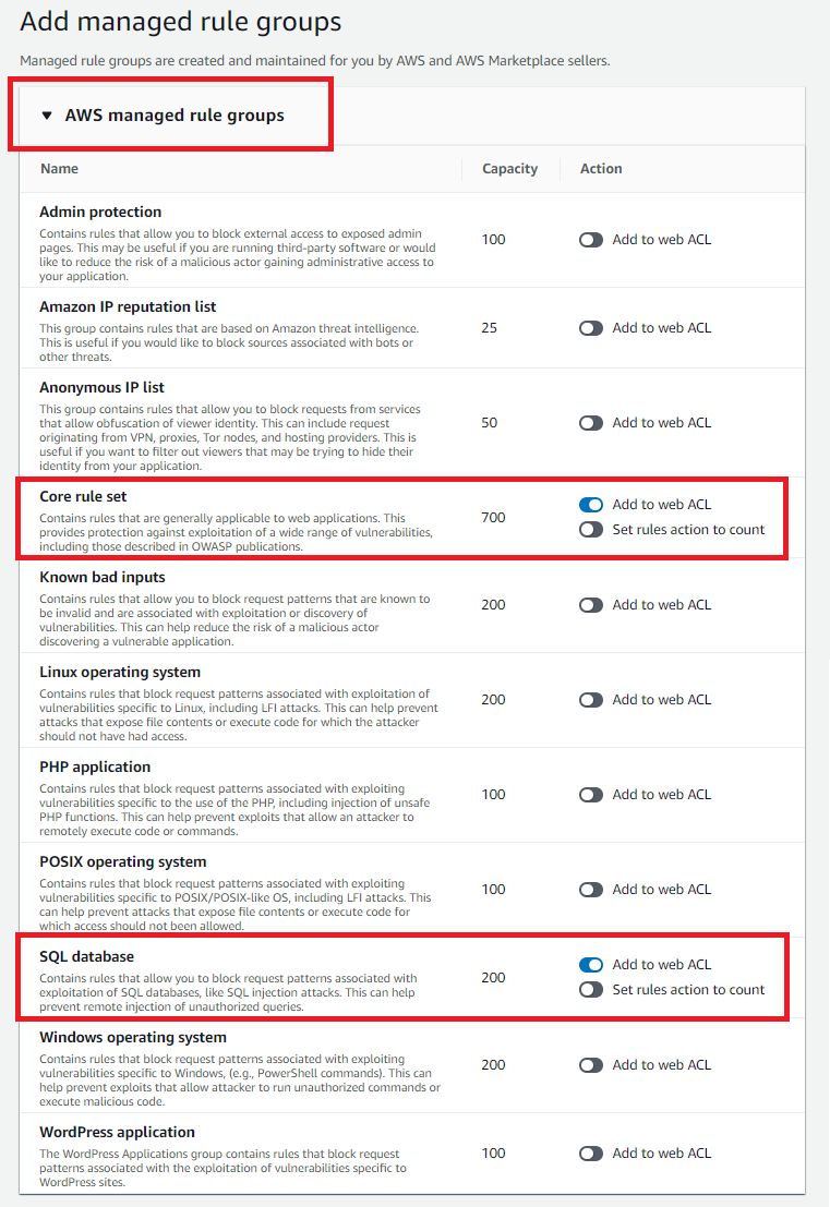 Add rules > Add managed rule groups로 들어와서 AWS managed rule groups를 눌러주자