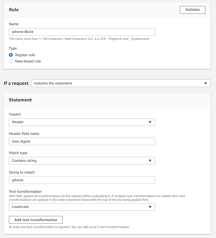 이 때, 대문자/소문자 상관 없이 검사하기 위해 Lowercase 라는 Text transformation 옵션을 넣어준다
