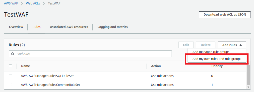 위와 똑같이 WAF에서 Add my own rules and rule groups를 눌러주자