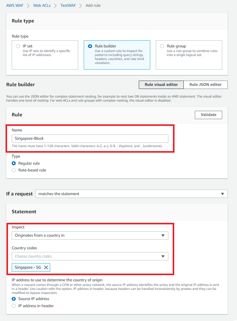 Statement의 Inspect는 Origin from a country in 으로, Country Code는 싱가포르를 검색해 지정해준 후 Rule 생성을 완료해주자