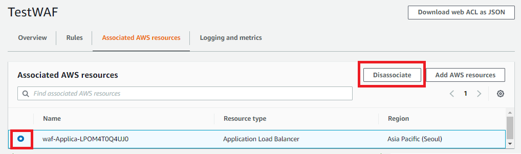 1) WAF Web ACL의 Associate AWS resources 탭에서 ALB와의 연결 해제