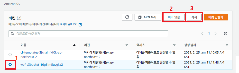 3) S3 bucket 비운 후 삭제 (안비우면 삭제 안됨) (둘 다 지워야됨)