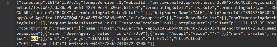 첫번째줄은 curl -i -H "x-value: bot" $waf_url 명령의 결과라서 x-value값이 bot이다