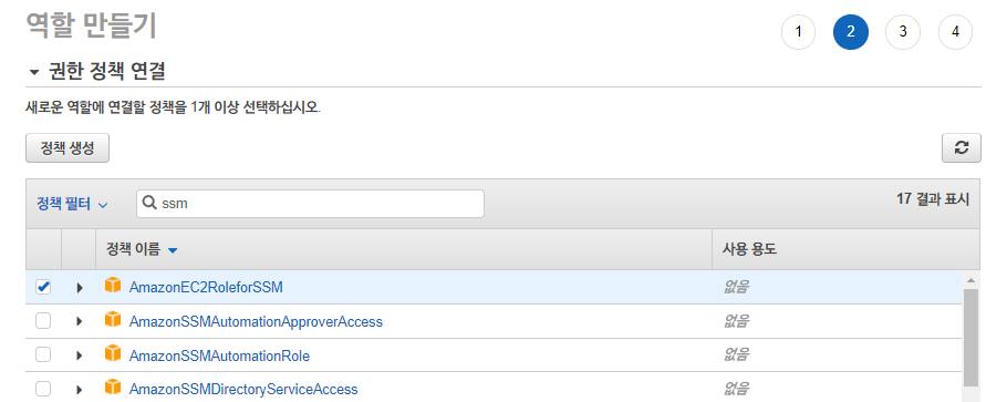 이미 존재하는 AmazonEC2RoleforSSM을 연결해주고, 이름은 원하는대로 설정한 후 완료해주자