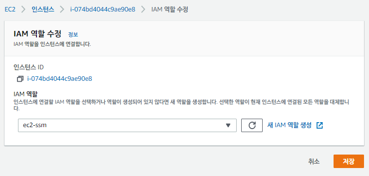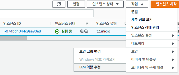 이제 SSM을 붙일 인스턴스로 가서 작업 > 보안 > IAM 역할 수정을 눌러준다