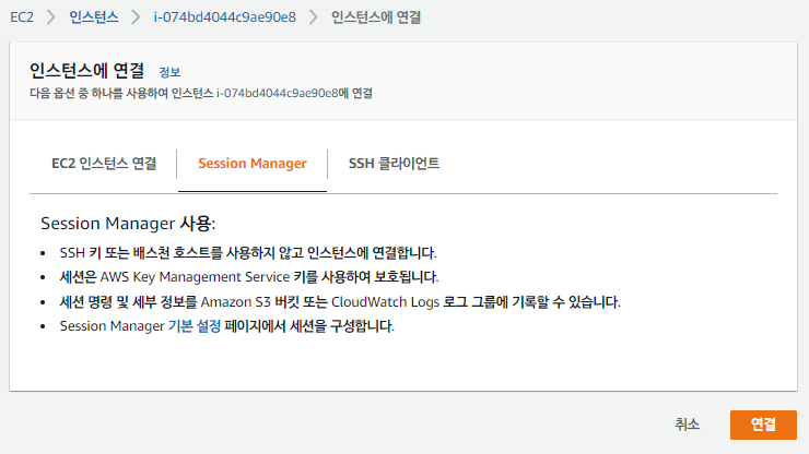 이제 다시 해당 인스턴스로 돌아가서, 연결 > Session Manager를 눌러준다