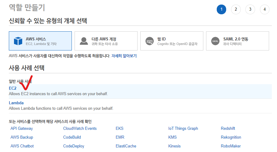 EC2에다가 SSM에서 접근 가능하도록 Role을 붙여주는거니까 EC2로 골라주자