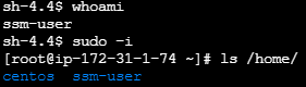 이런 세션 매니저 창이 뜨게 되고, 원래 서버의 ssm-user라는 새 유저로 접속된 걸 확인할 수 있다