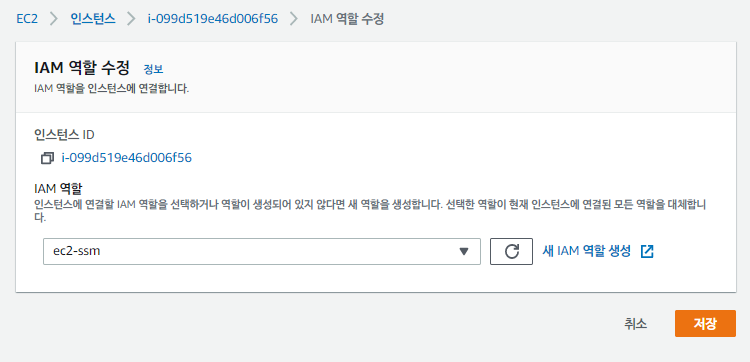 저번 글에서처럼 AmazonEC2RoleforSSM이 포함된 정책이 연결된 IAM role을 EC2에 붙여주자