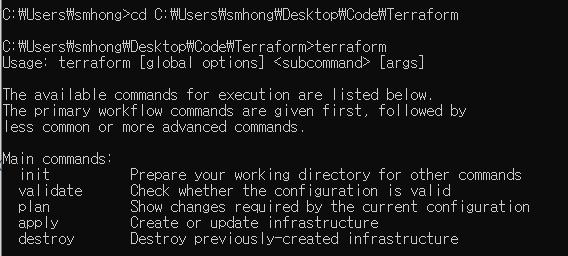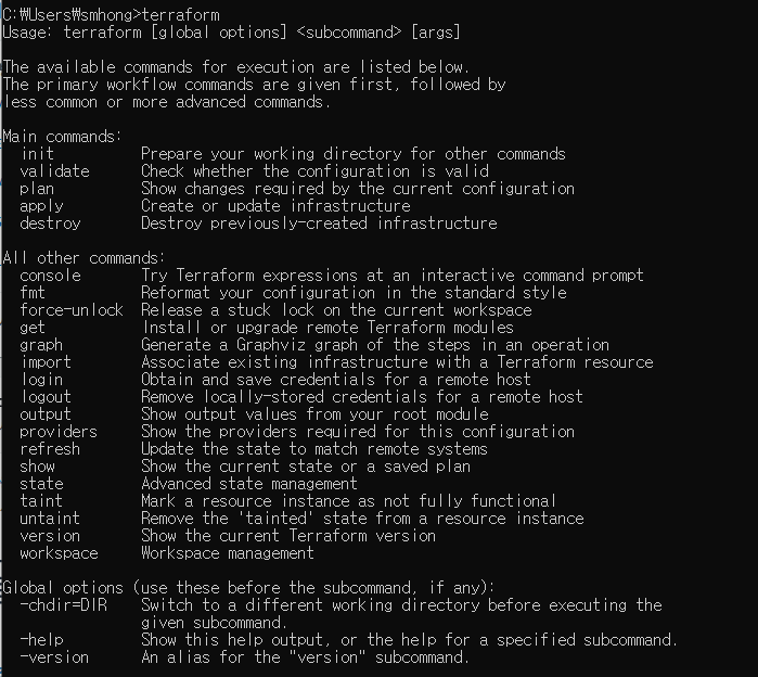 cmd로 아무 위치에서 terraform을 쳤을 때 위와 같이 나오면 terraform 설치는 끝이다