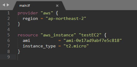 aws_instance 자리엔 생성할 리소스 타입을, testEC2 자리엔 가독성을 위해 다른 코드들과 구분될만한 이름을 적어주면 된다