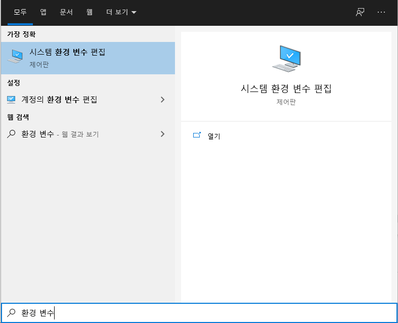 환경 변수를 검색해서 시스템 환경 변수 편집으로 들어가자