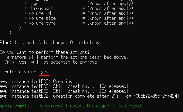 마지막으로 apply 명령으로 테라폼을 실제로 실행시키게 되는데, 변경 내역을 확인한다고 하기 위해 중간에 yes를 한번 쳐주고 진행하면 끝난다