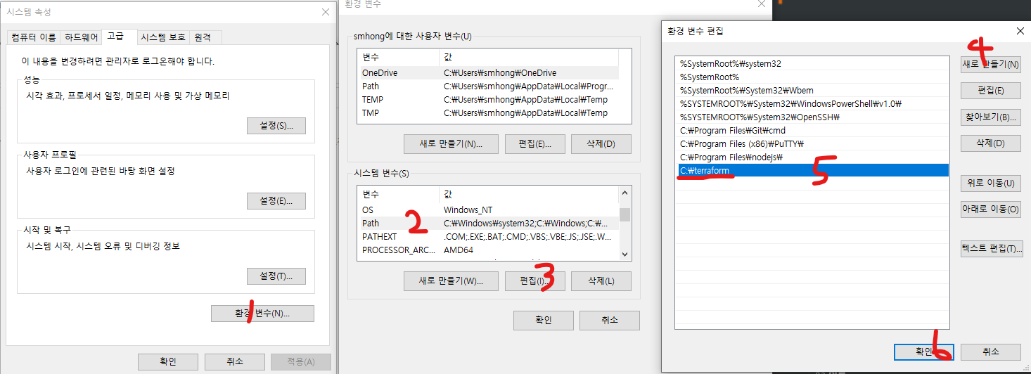 위와 같은 방법으로 시스템 변수의 Path에 C:\terraform을 추가해주고 확인을 눌러준다