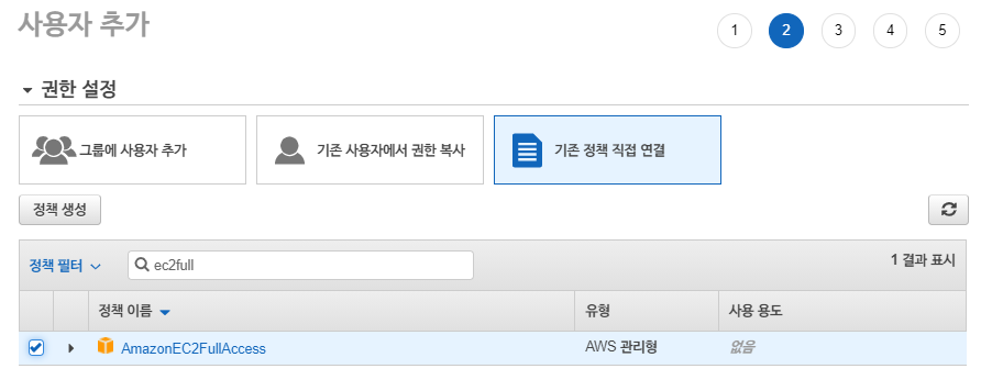 EC2만 만들어볼거니까 AmazonEC2FullAccess만 연결해준다