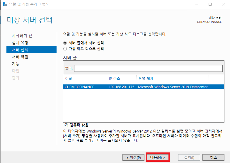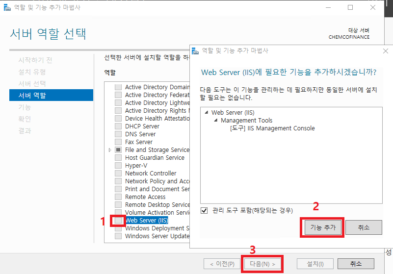 둘 중 하나의 경로로 들어가면 아래와 같은 역할 및 기능 추가 마법사 가 뜬다