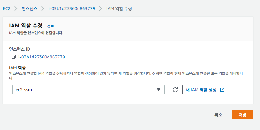 인스턴스 상태가 실행 중이 되면, 위에서 만든 ec2-ssm 역할을 붙여준다