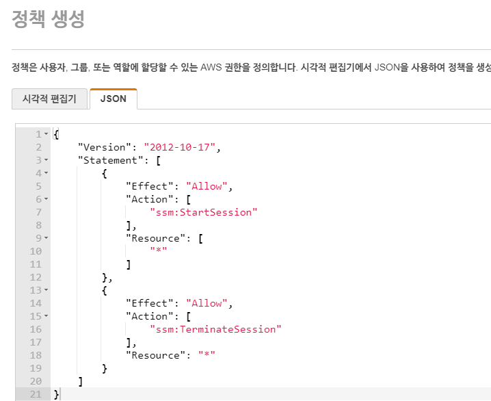 기존 정책 직접 연결 > 정책 생성 > JSON