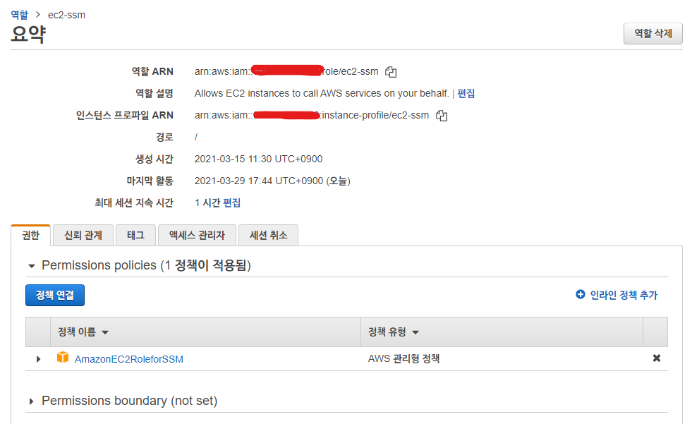 먼저 AmazonEC2RoleforSSM 정책이 붙어있는 IAM 역할을 만들어주자. 난 ec2-ssm 이란 이름으로 만들었다
