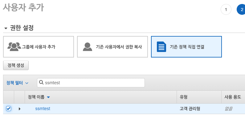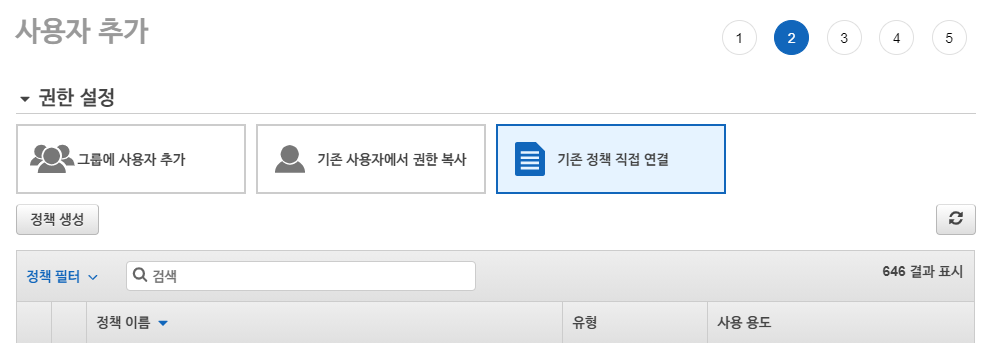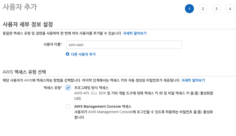 이름을 대충 정해주고, 프로그래밍 방식 액세스만 체크해서(cli로만 사용할 계정이니까) 권한 탭으로 넘어가자