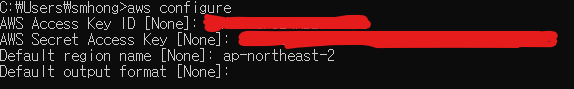 액세스 키와 시크릿 키를 다운받든 복사해두든 하고, cmd에서 aws configure를 실행한다