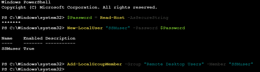 Add-LocalGroupMember -Group “Remote Desktop Users” -Member “SSMuser”