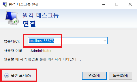 연결할 컴퓨터에 localhost:55678(자신이 적은 로컬 포트번호)를 적어준 후, 옵션 표시를 누른다