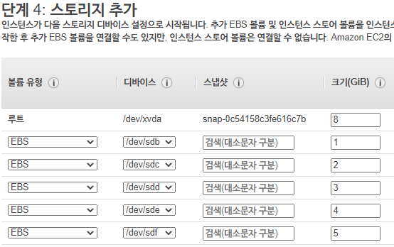 EC2를 생성할 때, 아래와 같이 EBS들을 붙여서 생성해보겠다