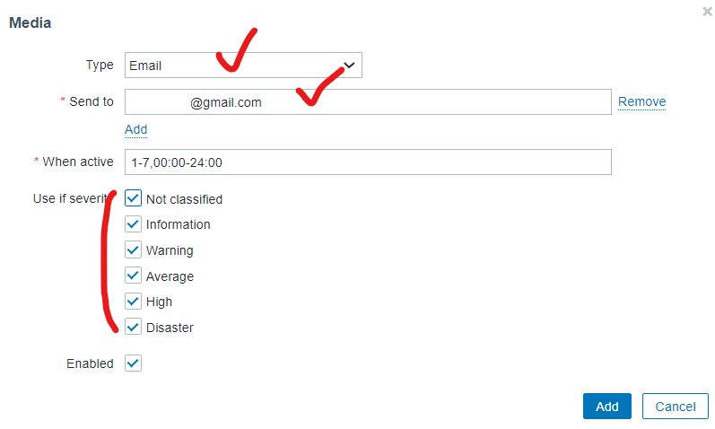 Type을 Email로 설정한 뒤, 본인의 이메일을 적고 어느 심각도에 따라 메일을 전송할건지 선택해주자