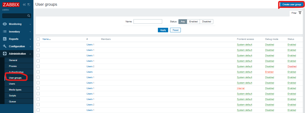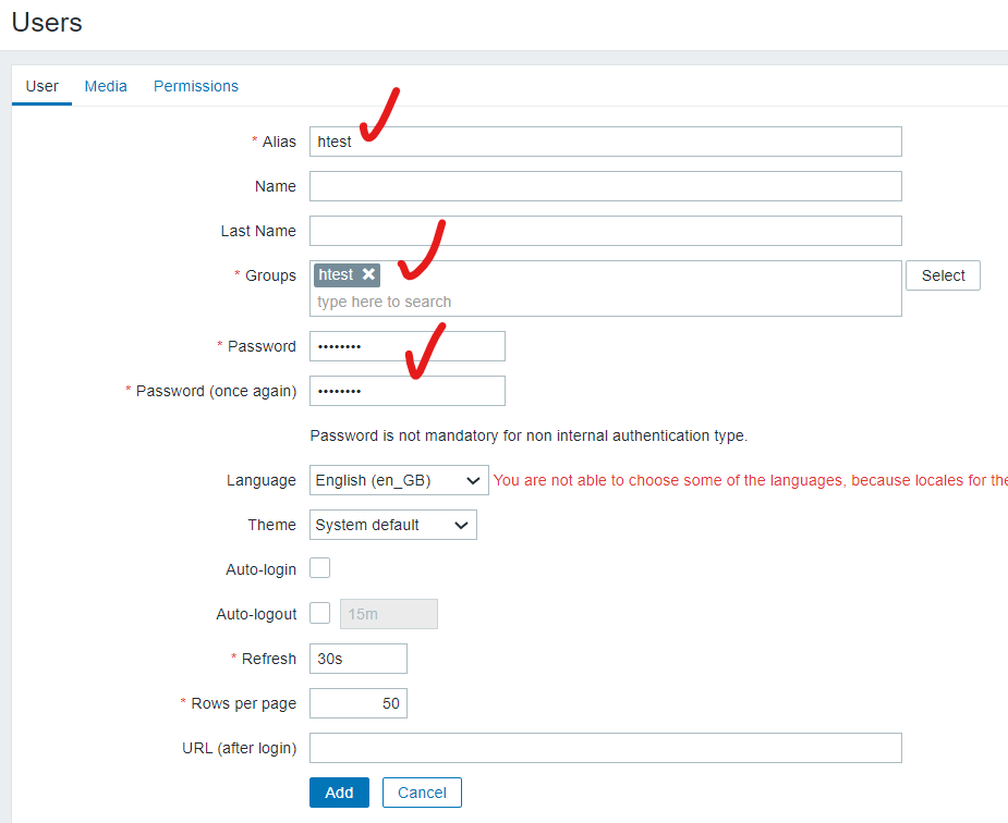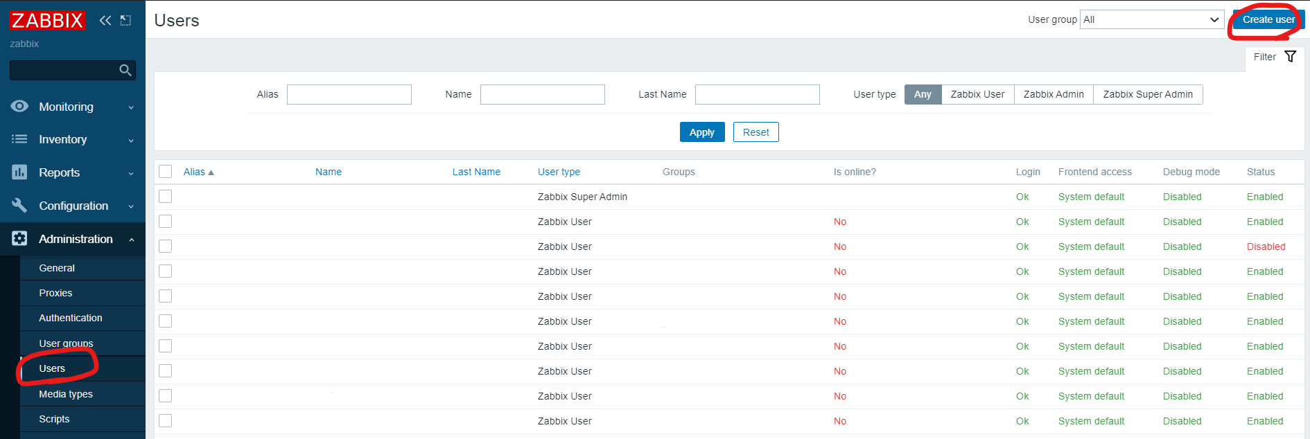 User 탭에선 이름(Alias)과 User group, 비밀번호를 설정해준다