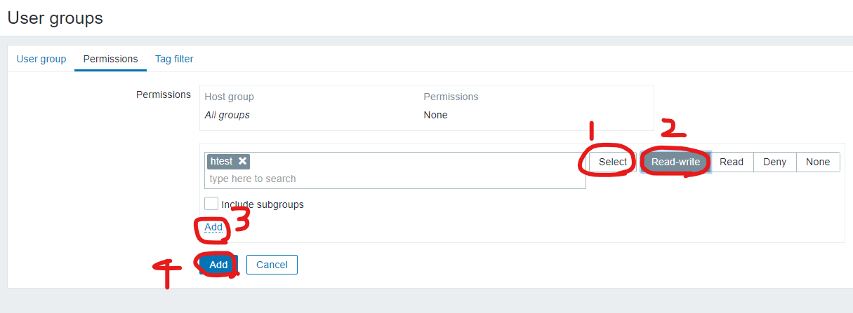 Group Name은 알아서 짓고, Permissions 탭으로 가서 아래와 같이 Host group을 골라서 Add해주자