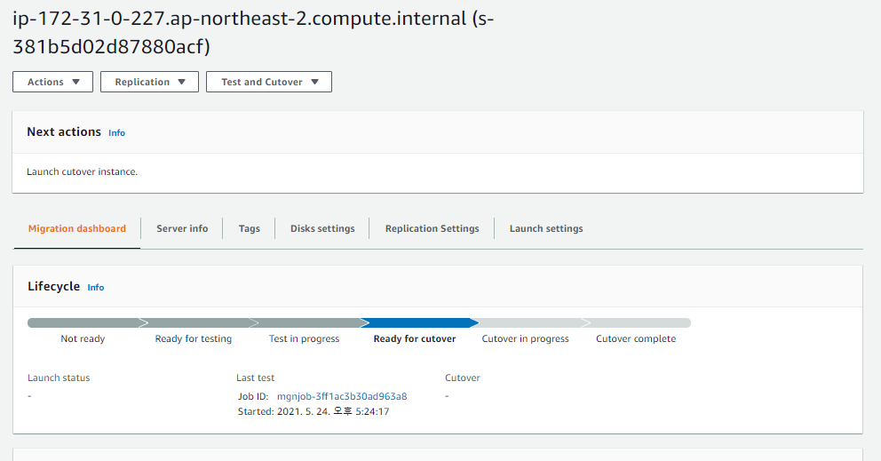 Test and Cutover > Launch cutover instances를 눌러 cutover를 진행해주자