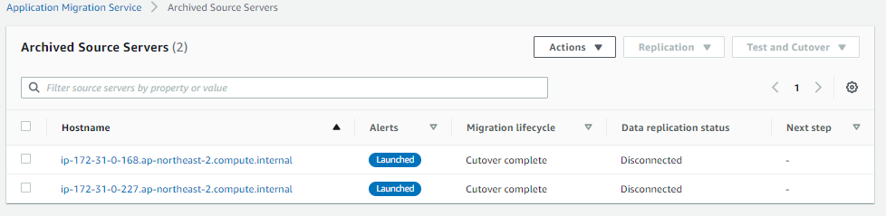 마이그레이션을 모두 끝낸 서버는 MGN 콘솔의 Source Server 탭에서 사라지게 되는데, 아카이브된 서버들은 따로 볼 수 있다 (그건 이따가 확인)