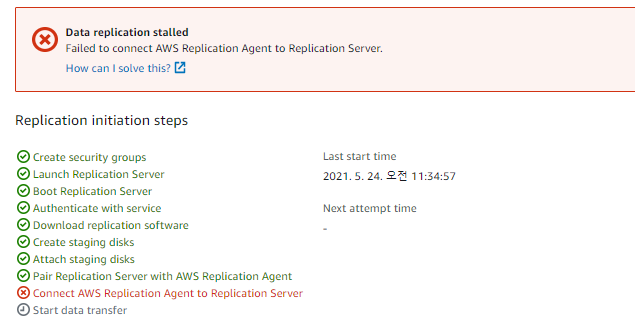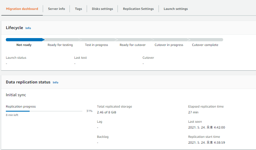 설치 후 MGN 콘솔로 돌아와보면 Replication이 진행되는 상황을 확인할 수 있다