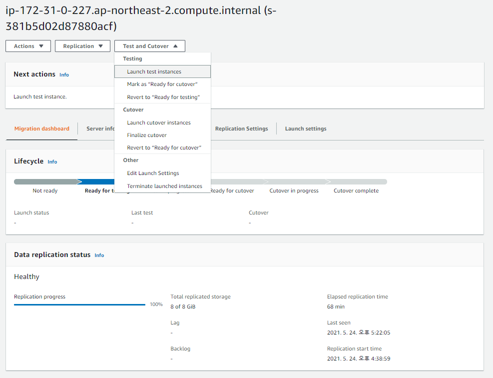 Replication 준비가 끝났다면 Test and Cutover > Launch test instances를 눌러주자