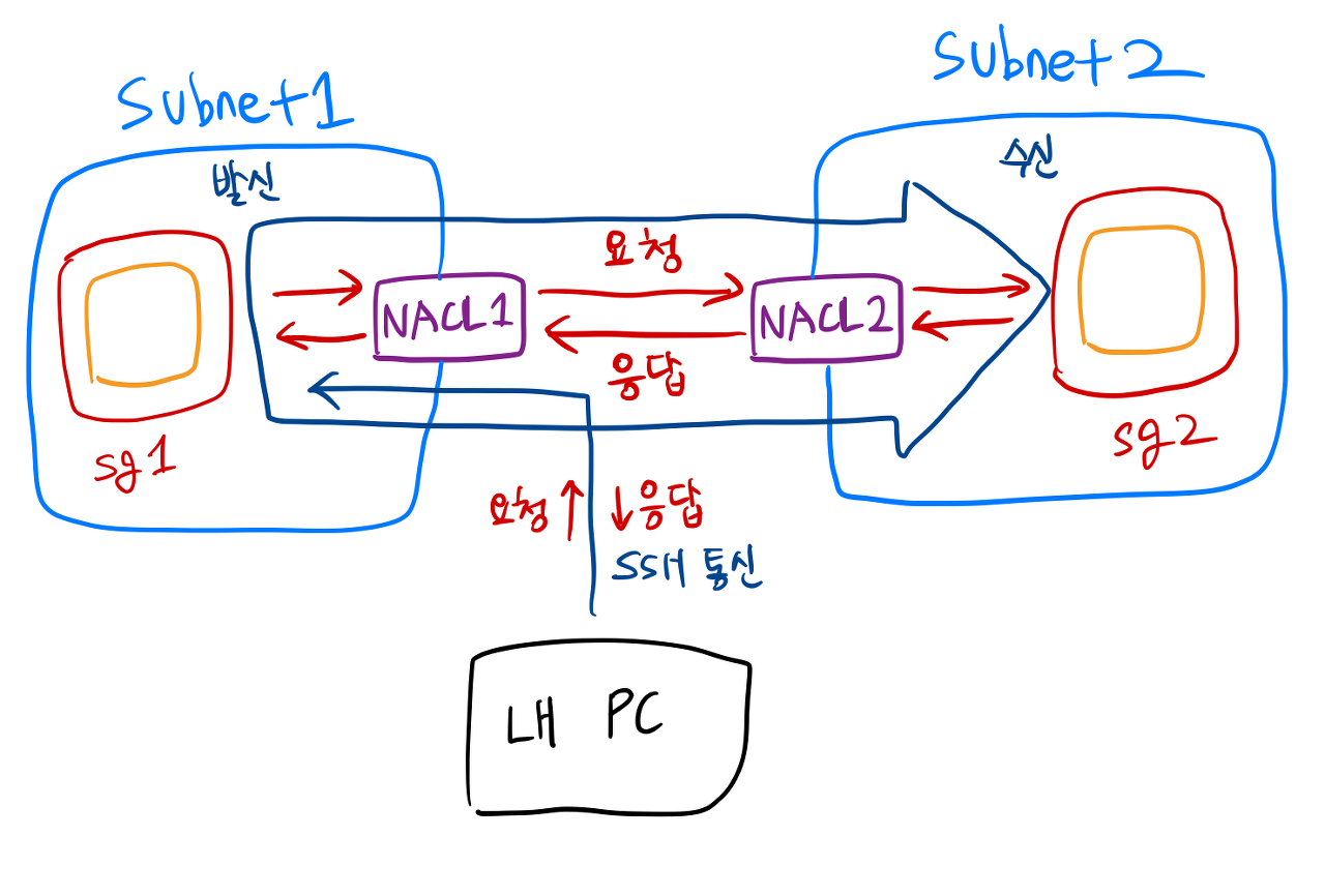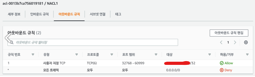 sg1에서의 아웃바운드와 sg2에서의 인바운드만 설정해주면 되던 Security Group과는 다르게, NACL은 각각의 서브넷에서 인바운드/아웃바운드를 같이 설정해줘야 한다