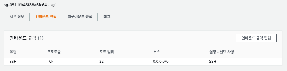 sg1 서버에 접속하기 위한 SSH 규칙부터 만들어주었으나,,,
