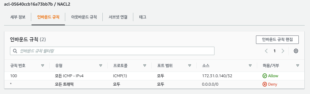 NACL1도 마찬가지로 ICMP All로 sg2에 대한 허용 규칙을 만들어 두었다