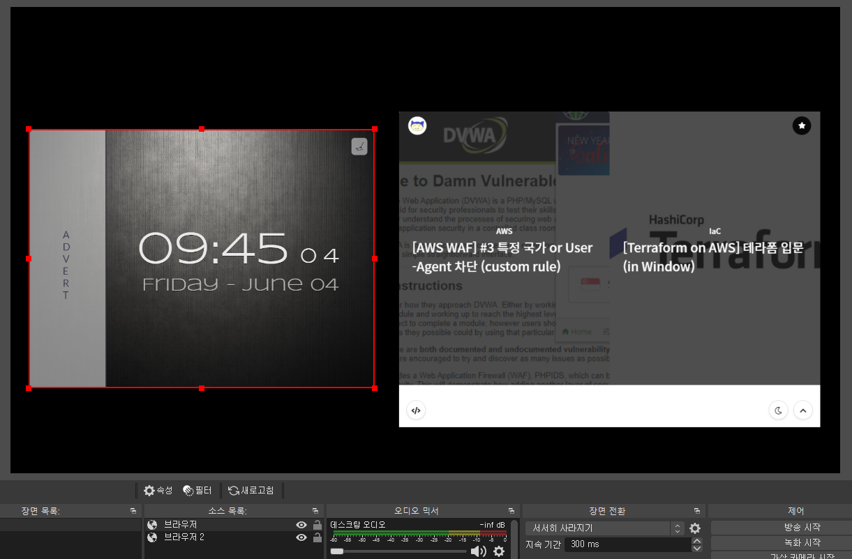 그리고 브라우저 소스를 넣어주면 입력한 URL의 화면 또한 출력할 수 있다