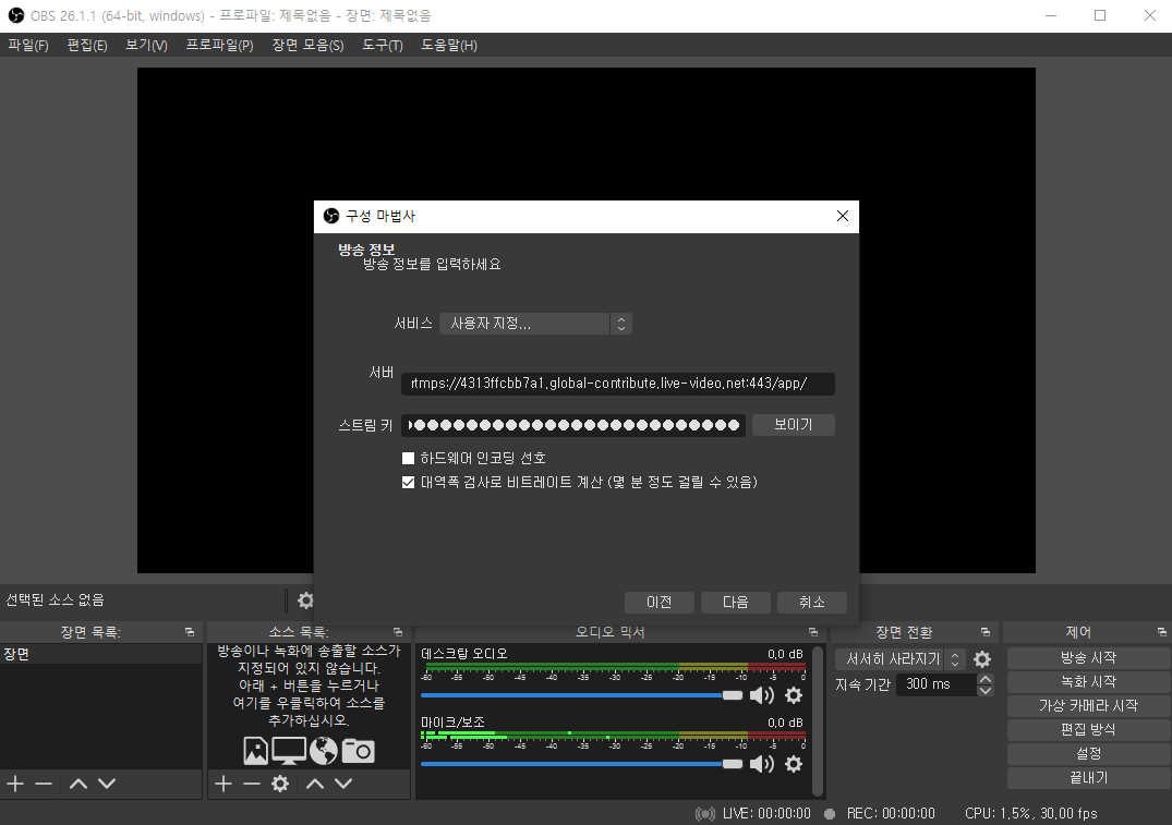 서비스를 사용자 지정으로 설정한 다음, 수집 서버와 스트림 키를 입력해주자