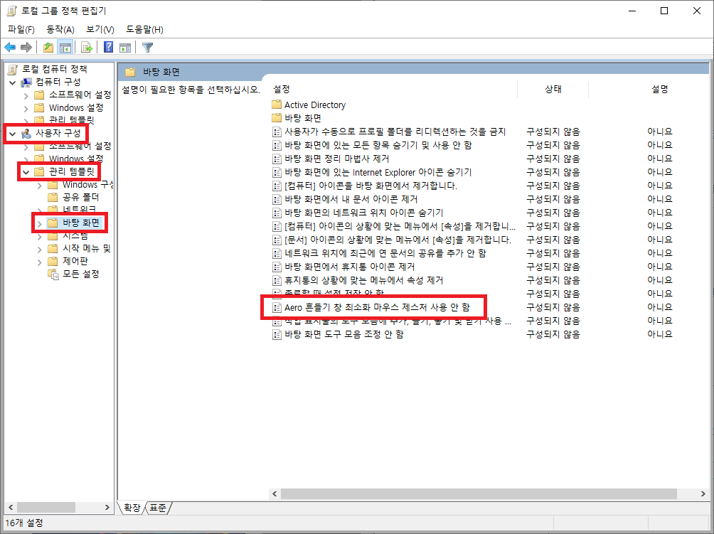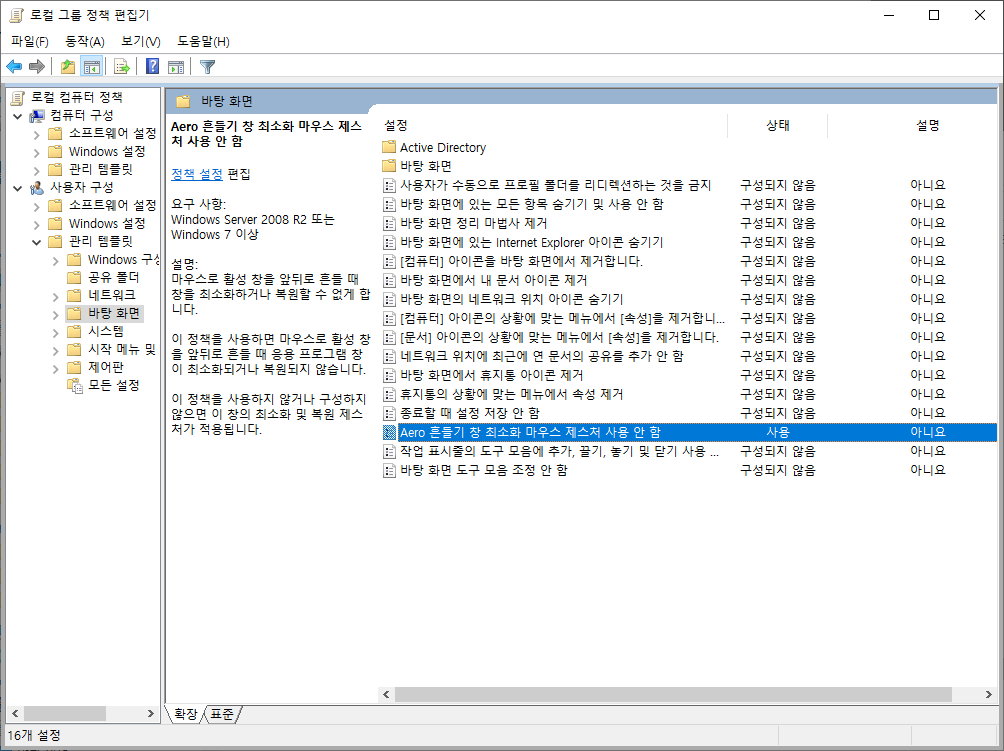 사용자 구성 > 관리 템플릿 > 바탕 화면 으로 들어가면 Aero 흔들기 창 최소화 마우스 제스처 사용 안 함 설정이 있다
