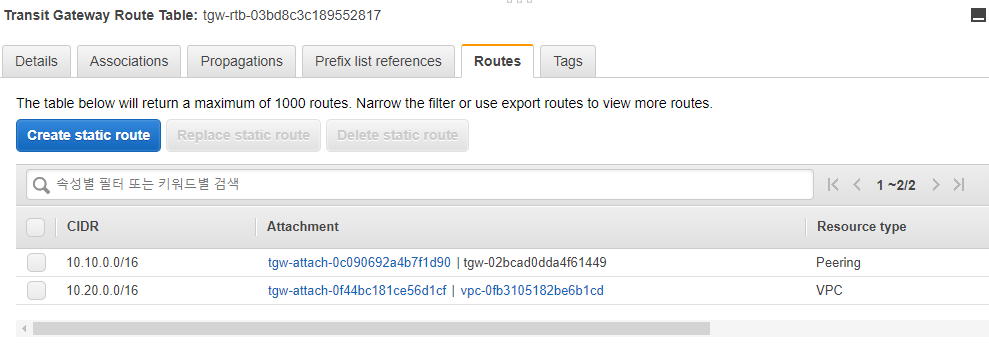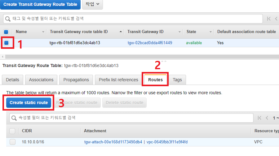 콘솔 > VPC > Transit Gateway 라우팅 테이블 에 들어가면 기본으로 생성된 라우팅 테이블이 있다