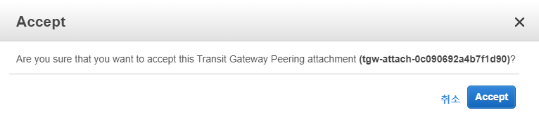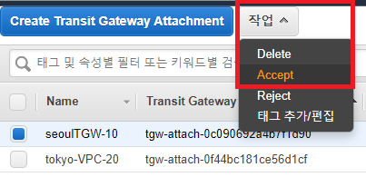 저렇게 상태가 바뀐 후 도쿄 리전의 TGW 연결 탭에 가보면 해당 Attach가 생성되어있다 (똑같이 pending acceptance 상태)