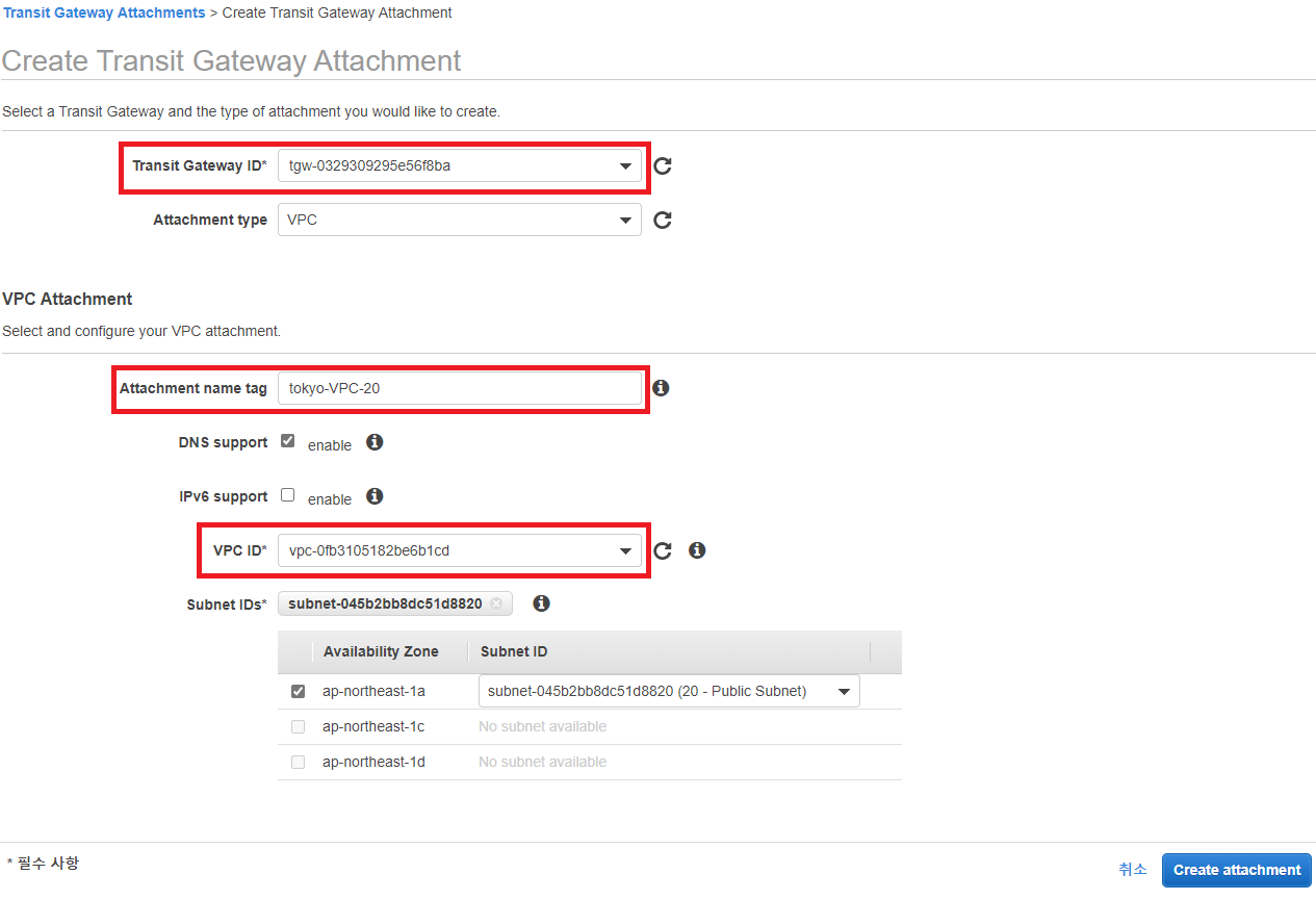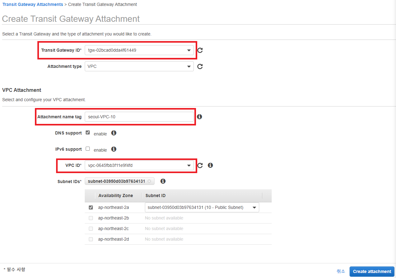 콘솔 > VPC > Transit Gateway 연결 > Create Transit Gateway Attachment
