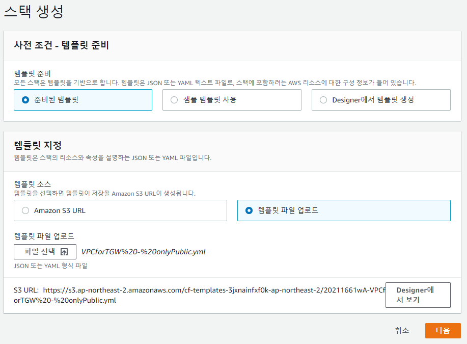 AWS Console > CloudFormation > 스택 생성 > 템플릿 파일 업로드 > 위의 파일 선택
